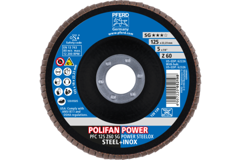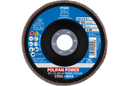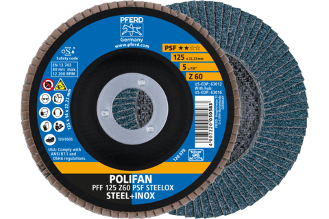 Informații tehnice : Disc lamelă POLIFAN PFF 125x22,23 mm plat Z60 Universal Line PSF STEELOX oțel/oțel inoxidabil |